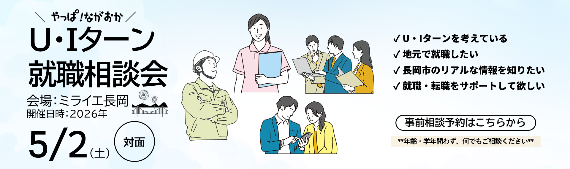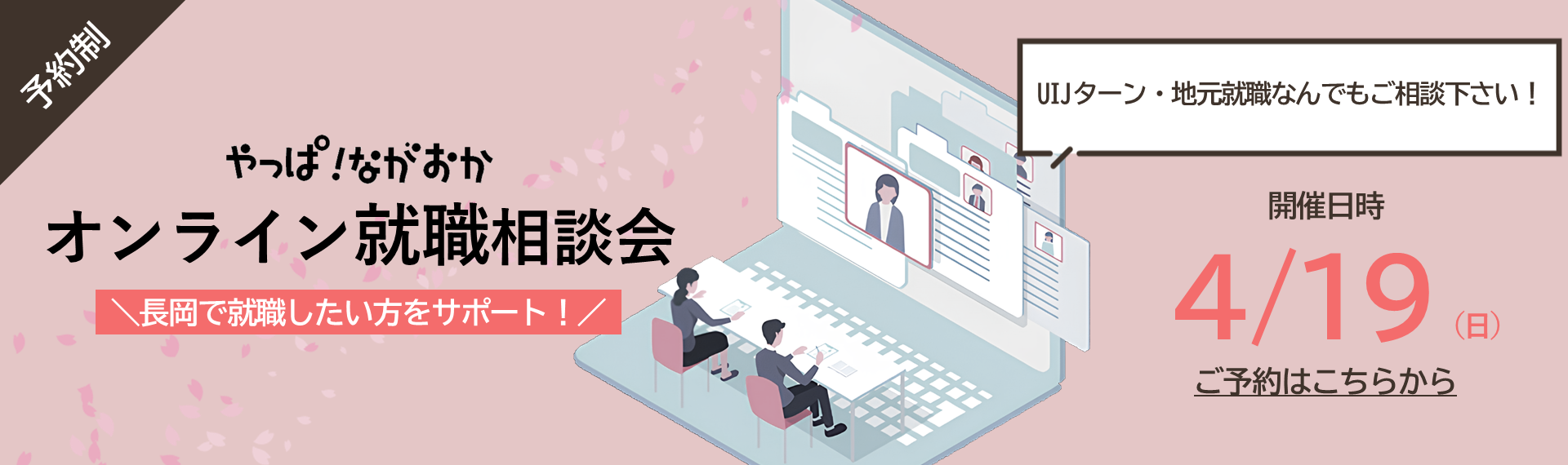 - 2026年03月17日 お知らせ イベント情報 「やっぱ!ながおか オンライン就職相談会」随時相談を受付中です